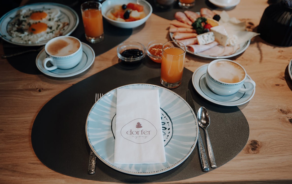Wer lieber mehr Auswahl möchte, kann auch das reichhaltige Frühstücksbuffet in unserem benachbarten Hotel Dorfer genießen – mit allem, was das Frühstücksherz begehrt.